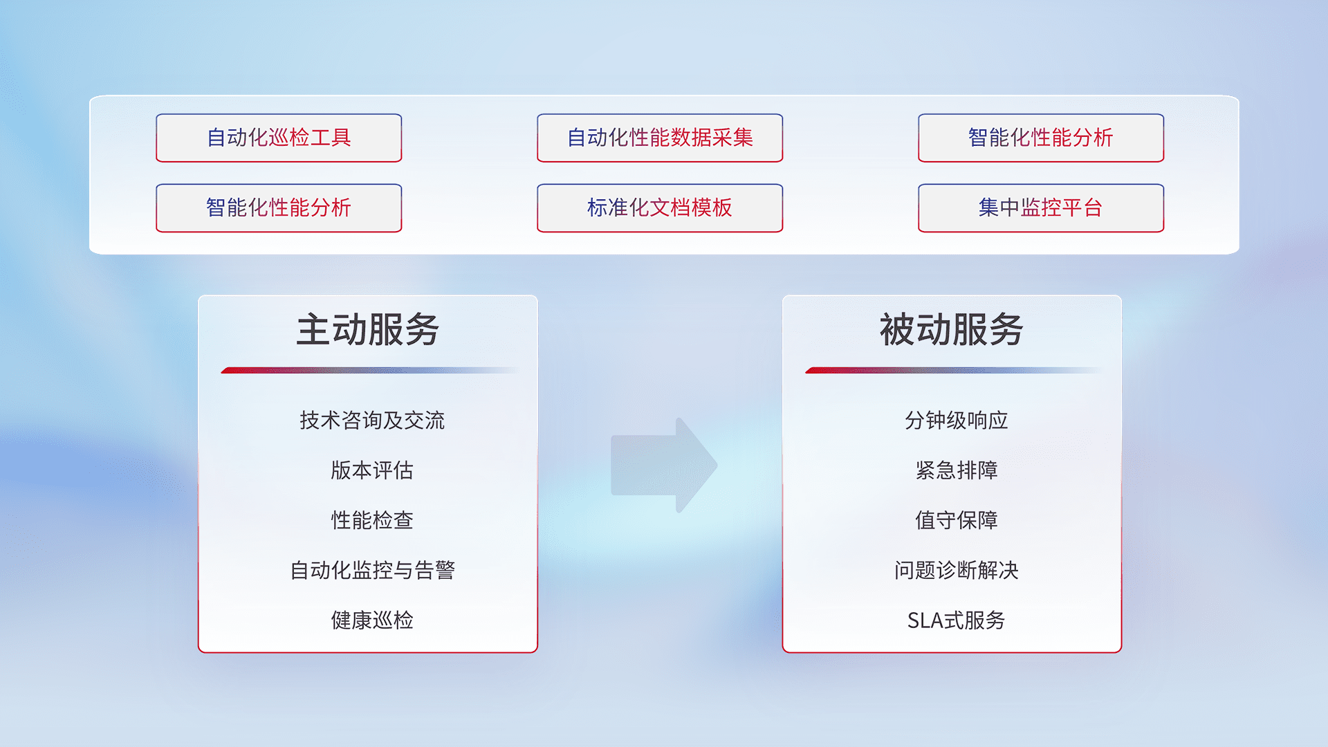 智能化工具和标准化文档,,保障服务质量,,,,提供主动服务(包含技术咨询、、、版本评估、、、性能检查、、、自动化监控与告警、、健康巡检)和被动服务包含(分钟级响应、、、、紧急排障、、、值守保障、、、、问题诊断解决、、SLA服务)。。。。
