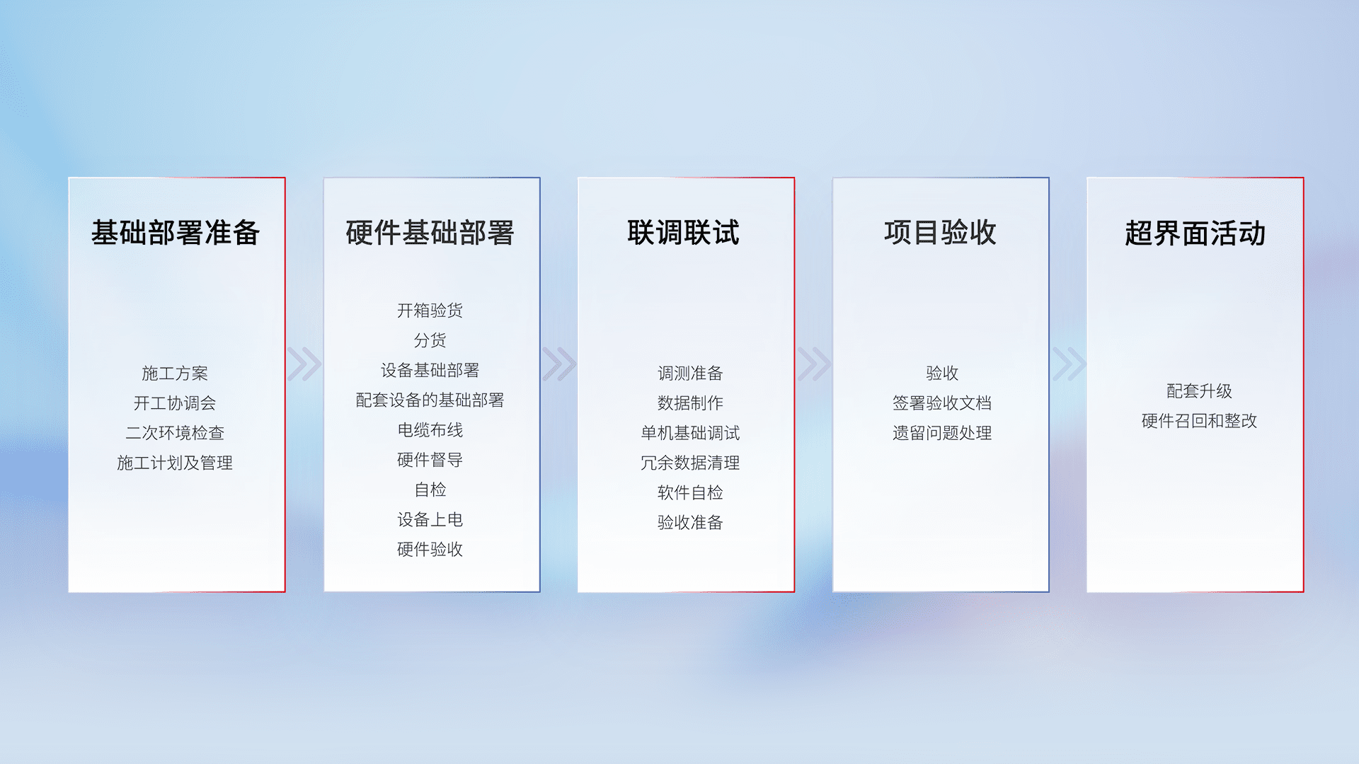 从基础部署准备、、、、硬件基础部署、、、联调联试、、、项目验收、、、、越界面活动的全过程可追溯,,保证施工质量和进度。。